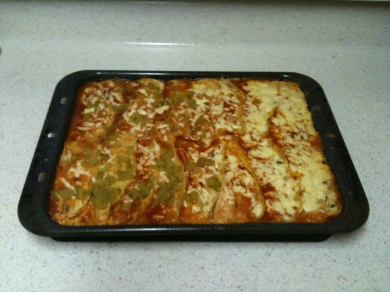 Place into a pan. Top with enchilada sauce and remaining cheese.